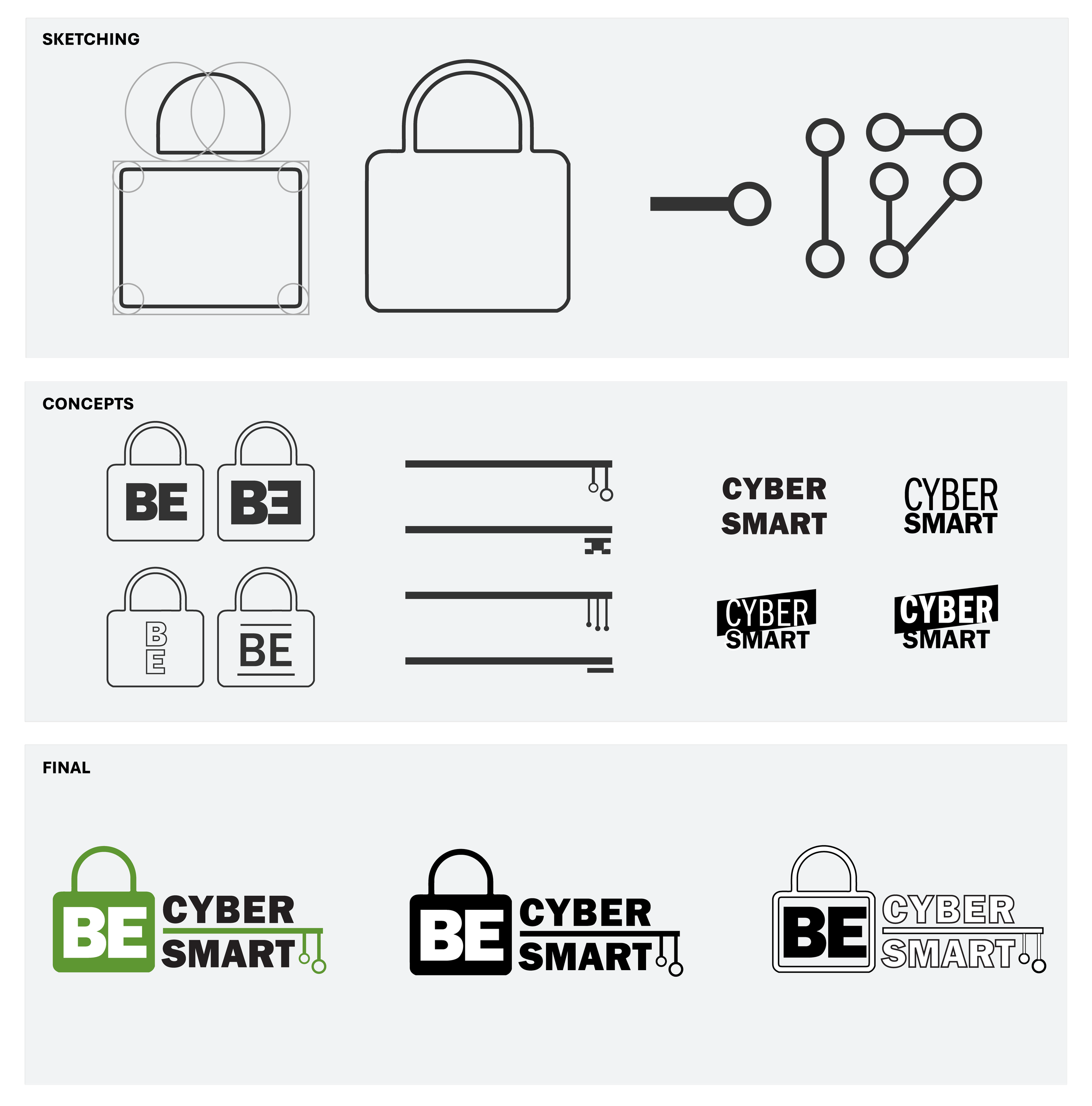Initial sketches explored symbols like locks, keys, and nodes, commonly associated with cybersecurity and digital protection. Several variations were tested, aiming to balance protection and connectivity in a simple yet powerful design.The final logo successfully merged these concepts into a cohesive design.